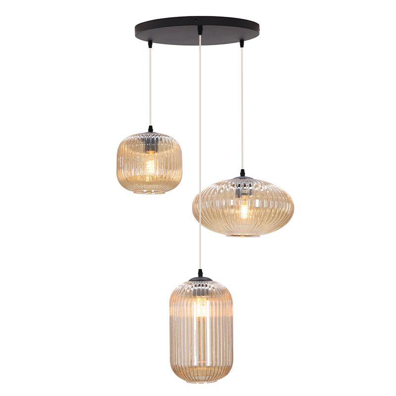 Die retro Pendelleuchte Charlois ist in der Farbe Bernstein und aus Glas gefertigt. Die Bernstein Pendelleuchte wird ohne passende Leuchtmittel geliefert. Diese Lampe benötigt 3 Lichtquellen mit E27-Fassungen. Die maximale Wattleistung der Lichtquellen ist 40 Watt.
