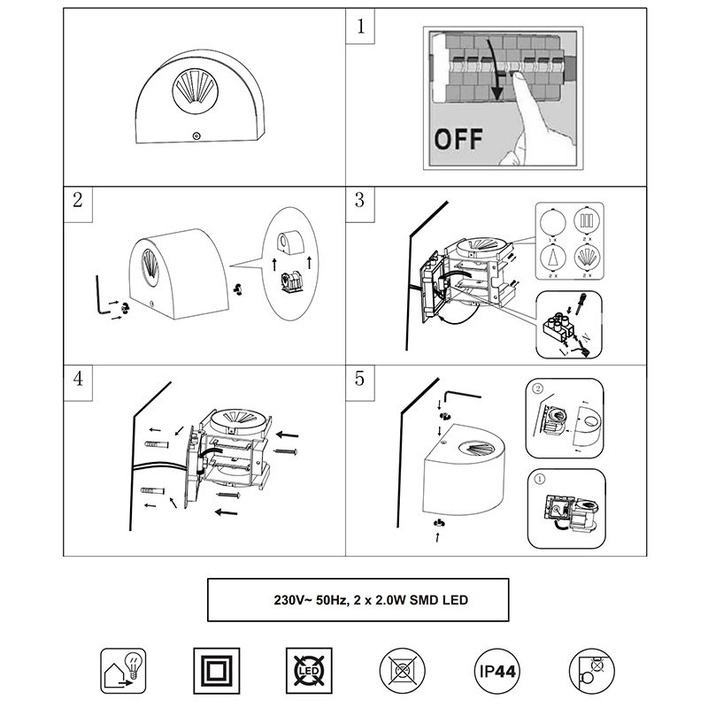 Produktinformatik Maximale Watt 2 Anschlussspannung 220-240V Anzahl der Lampen 2 Lichtleistung 200 Produktinformatik Farbtemperatur 3000K (Warmweiß) Fassung LED eingebaut Type Lichtquelle enthalten Intergriert LED Durchschnittliche Lebensdauer 30000 Inkl. Licht Ja, intergiert Breite in cm 15 Gewicht in kg 0.485 Höhe in cm 9 Länge in cm 15 Dimmbar Nein Garantie 2 Jahre IP-Wert IP44 (wasserdicht) Farbe Schwarz Material Kunststoff Mit Schalter Nein Mit Schnur und Stecker Nein Stil Design Artikelnummer Q14511 - Startseite